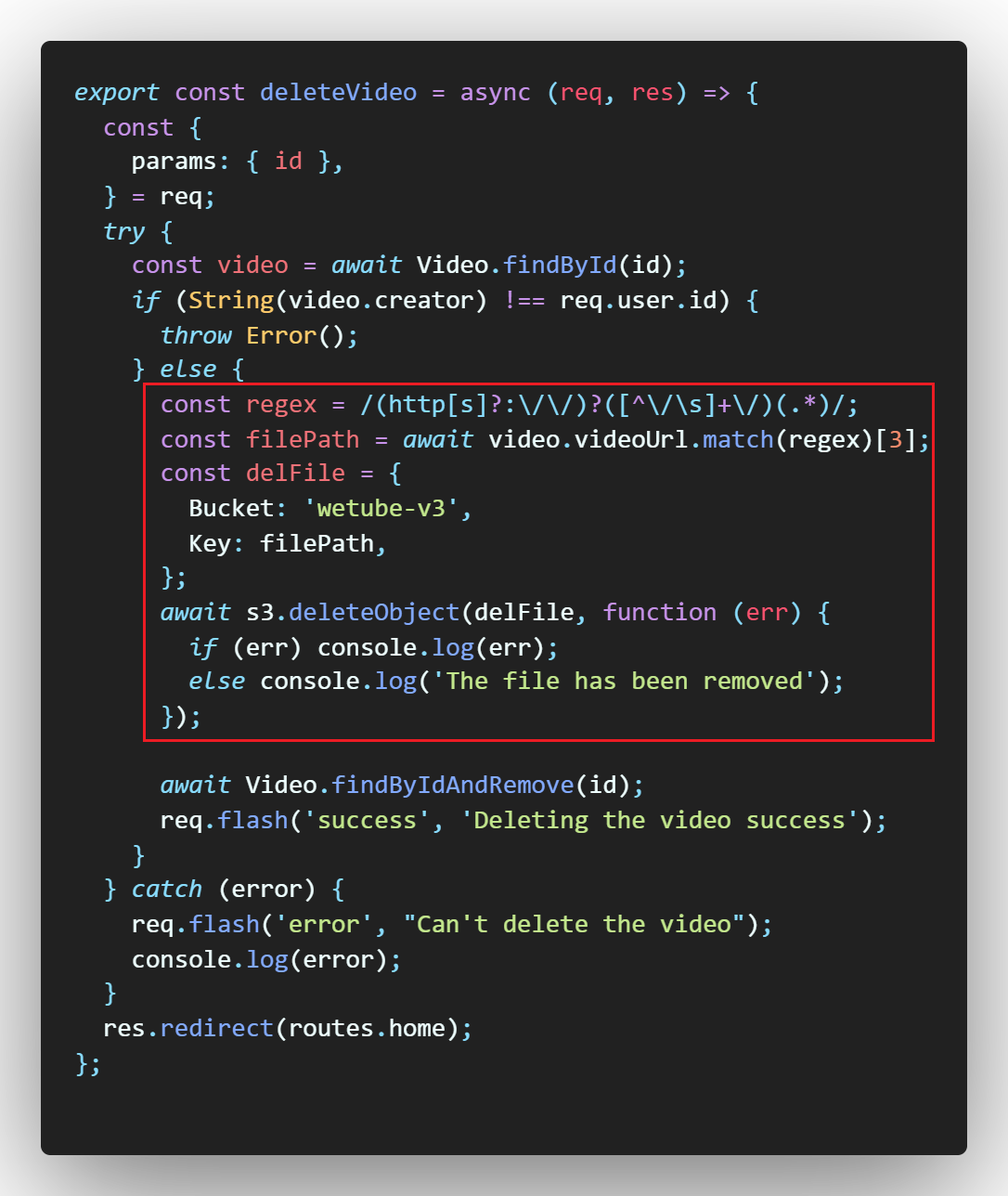 빨간색 박스가 기존에 있었던 deleteVideo에 추가된 코드다. 이 코드는 aws-s3에 있는 video를 삭제하는 기능을 한다.