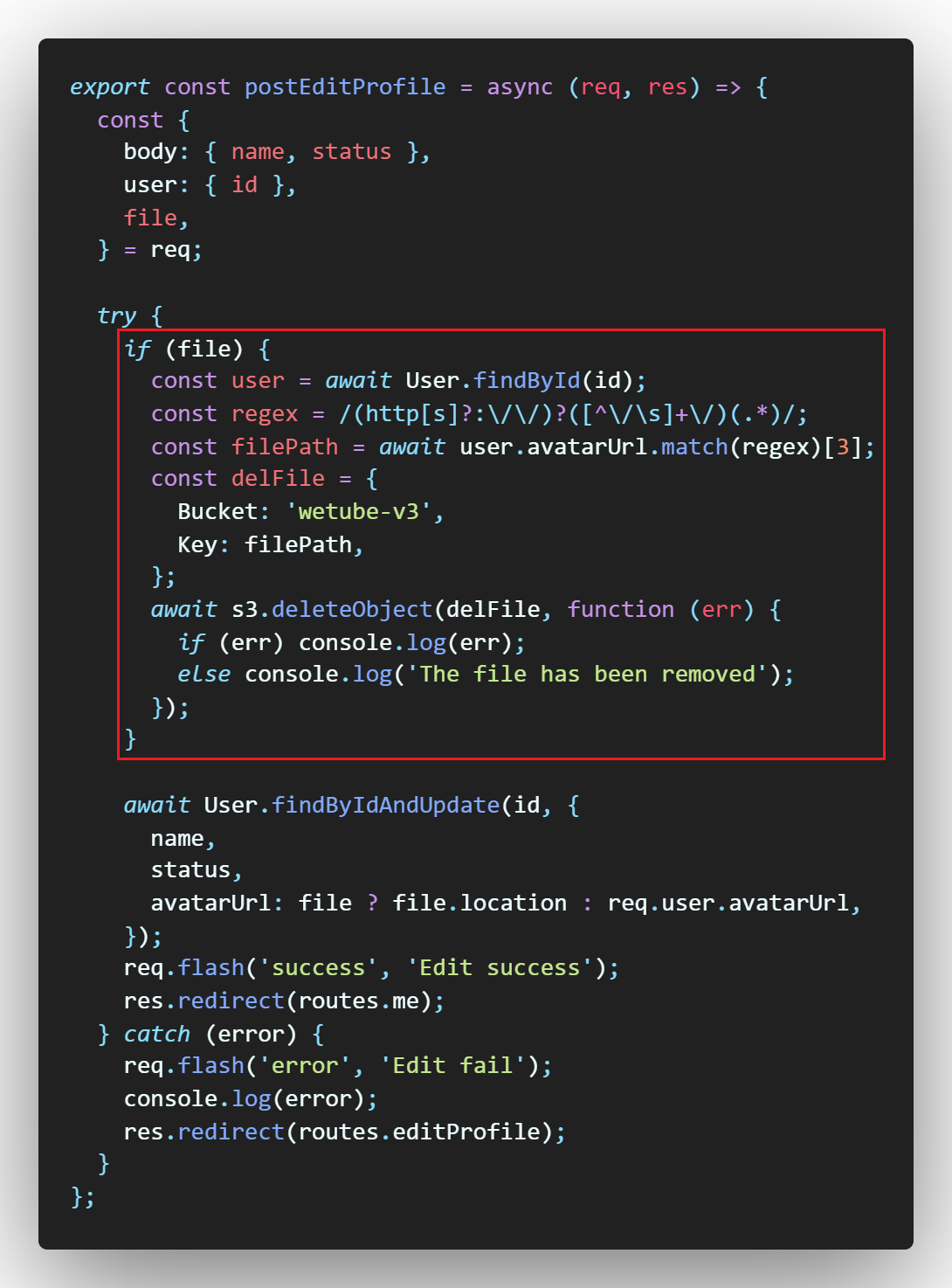 빨간색 박스가 기존에 있었던 postEditProfile에 추가된 코드다. 이 코드는 aws-s3에 있는 avatar를 삭제하는 기능을 한다.