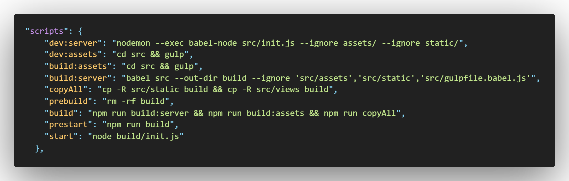 build를 하는 명령어는 npm start다. npm start를 하게 되면 그전에 prestart가 실행된다. prestart가 실행이 되면 build 명령어가 실행된다. build 명령어가 실행이 되면 build:server, build:assets와 copyAll이 실행 된다.