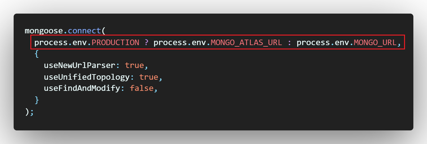 Deploy on heroku를 할 때 만 PRODUCTION=true가 된다. 그 때만 MONGO_ATLAS_URL을 사용하고 개발 과정에서는 local MongoUrl을 사용한다.