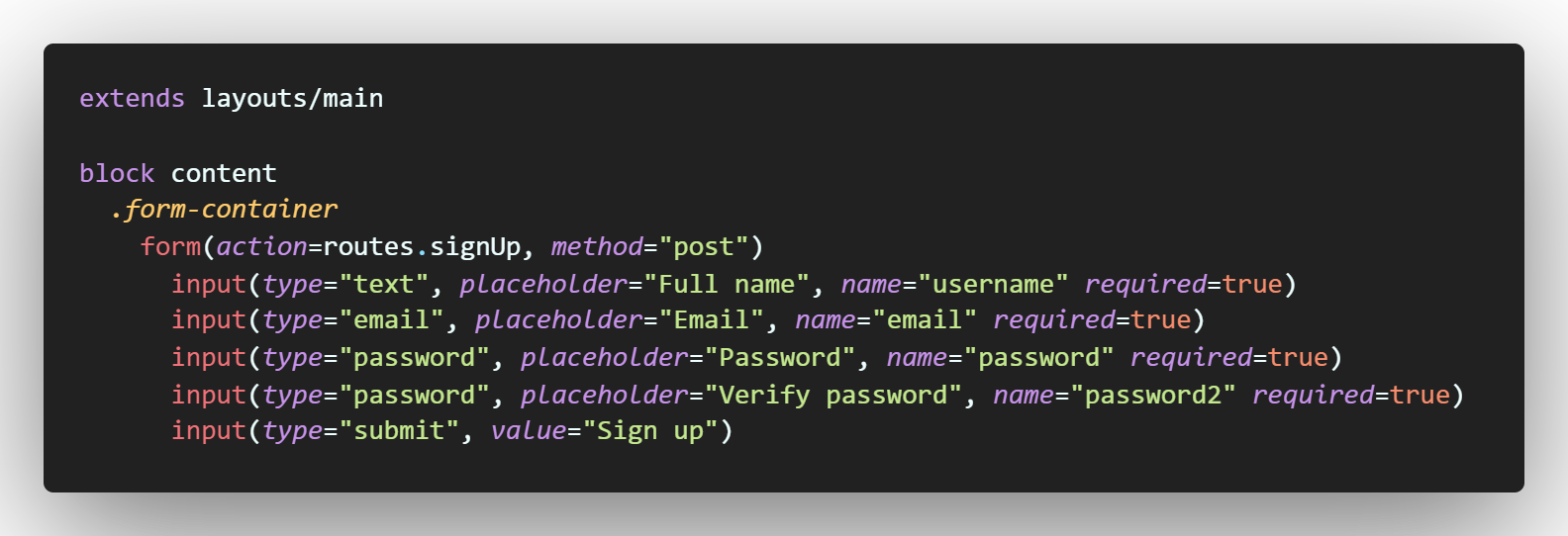 localhost:4000/sign-up 회원 가입 페이지에 가게 되면 랜더링될 pug 파일이다. 회원가입을 하는데 필요한 form 양식이다.