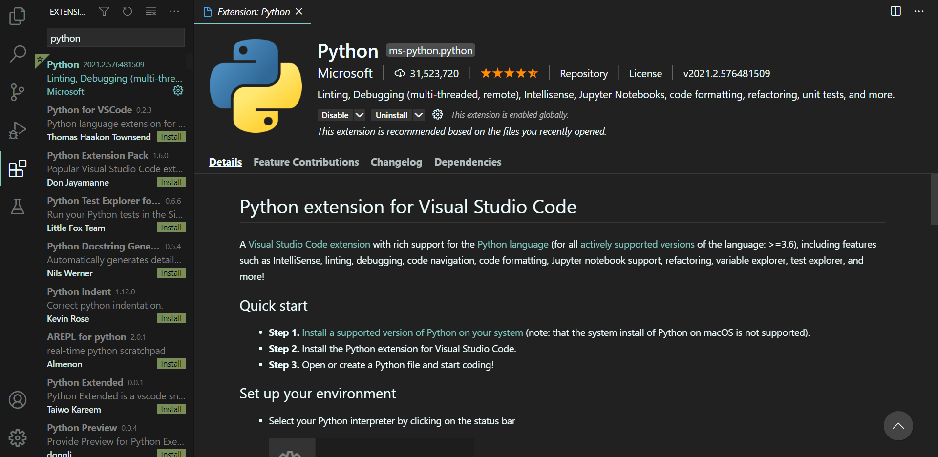 VSC를 쓴다면 Extension에서 python을 설치하자.