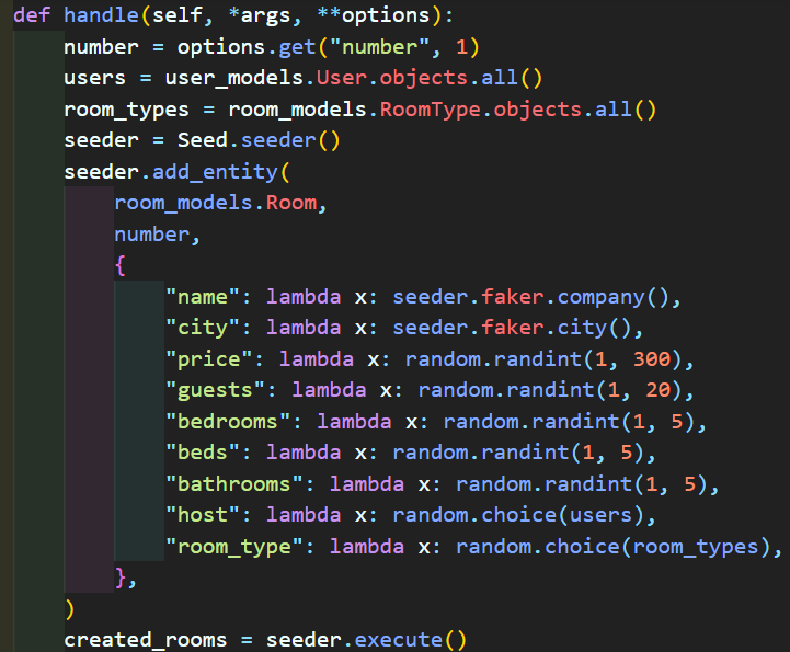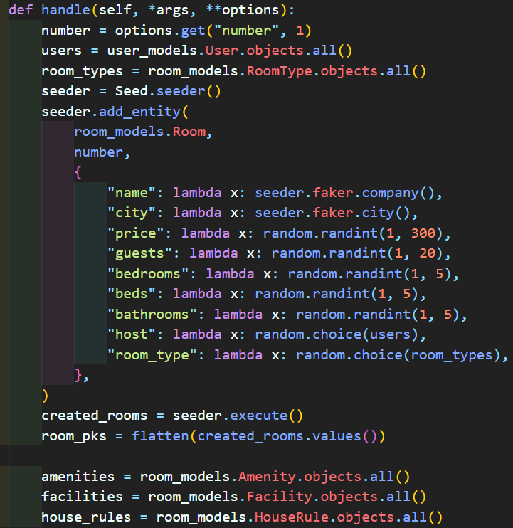 handle() method 실제 logic command다. add_arguments에서 만든 option을 options.get()을 통해서 가져오고 django-seed를 이용해서 test cases를 만든다. django-seed에 관한 설명은 django-seed 제목으로 추가했다.