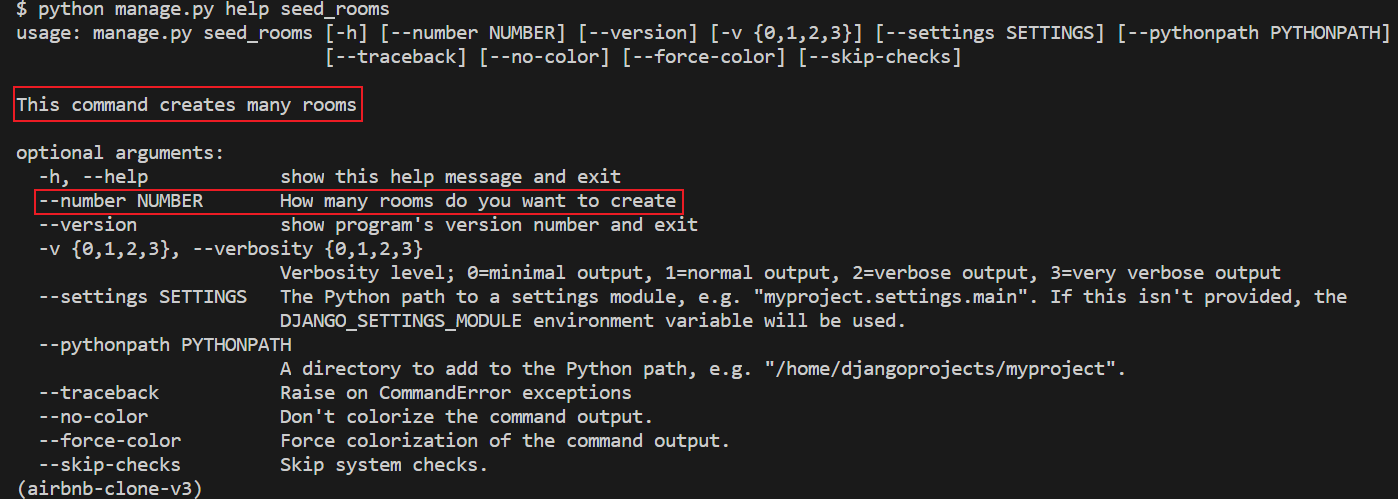 $ python manage.py help <command>를 치면 밑에 스크린샷과 같이 해당 명령어가 어떤 명령어이고 어떤 option이 있는지 알려준다. 빨간 박스는 위 source code에서 정의한 help다.
