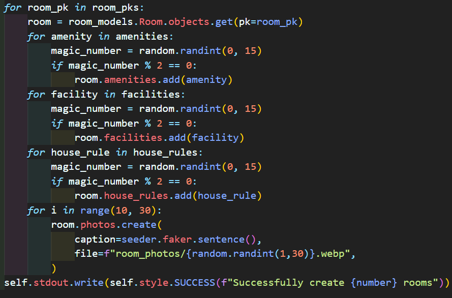 seeder.excute()가 주는 값은 dictionary다. created_rooms.values()를 하게 되면 [[4,5]]같이 이중 배열을 반환한다. django의 flatten은 이중 리스트를 단일 배열로 flat하게 만들어준다. 그렇게 얻은 room_pks로 amenities, facilities, house_rules와 photos를 추가해준다.