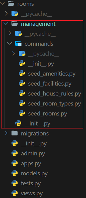 directory 구조는 다음과 같다. app/management/commands/<command_name>을 생성하면 된다. management와 commands folder에는 __init__.py를 생성한다. (__pycache__는 신경쓸 필요 없다. command를 실행하면 자동으로 생성되는 것이다.)
