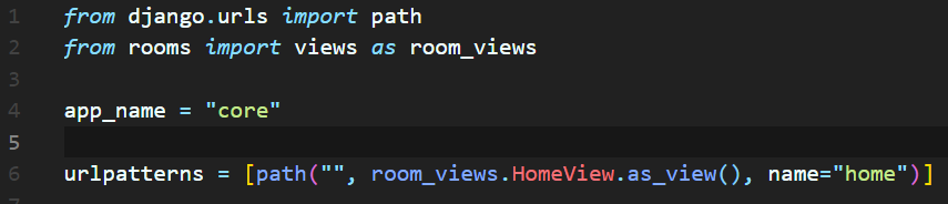 위 명령어를 쳤을 때 urls.py는 생성되지 않기 때문에 우리가 임의의로 생성해줘야 한다. 4 line에 app_name은 config/urls.py가 찾아갈 수 있는 app의 이름이다. core/urls.py에 app_name이 config/urls.py에 있는 namespace다.