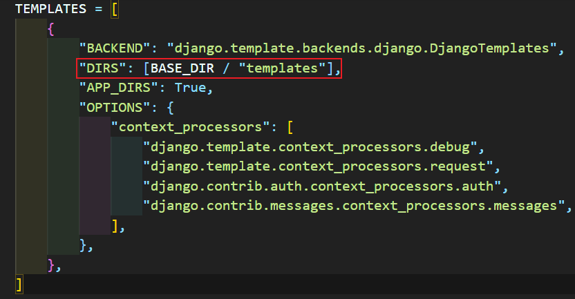 settings.py에 TEMPLATES list에 있는 DIRS에 다음과 같이 directory 경로를 추가해준다.