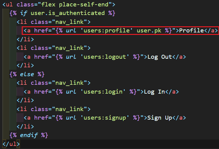 url template tag를 이용해서 user profile page로 갈 수 있게 한다. {% url 'users:profile' user.pk %}는 /users/<int:pk>/profile과 같다. 여기서 pk는 primary key 값으로 변수 값이다. urls.py에서 <int:pk>를 설정하였기 때문에 반드시 이에 해당하는 user.pk를 넘겨줘야 한다.
