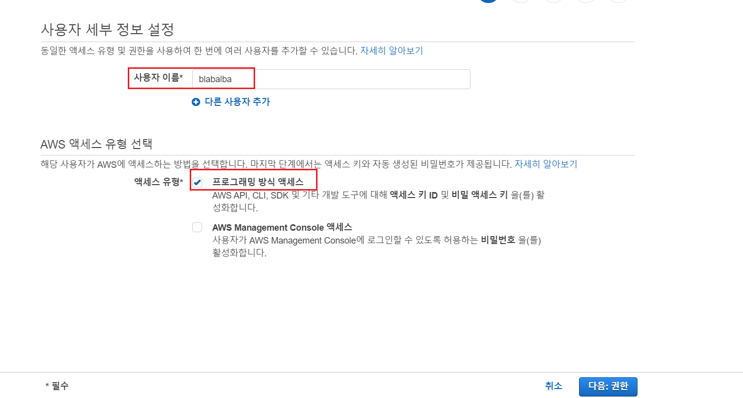 사용자 추가 사용자 이름은 당신이 원하는 대로 짓고 액세스 유형은 '프로그래밍 방식 액세스'를 선택한다. 우리가 필요한 것은 액세스 키 ID 및 비밀 액세스 키가 필요하기 때문이다.