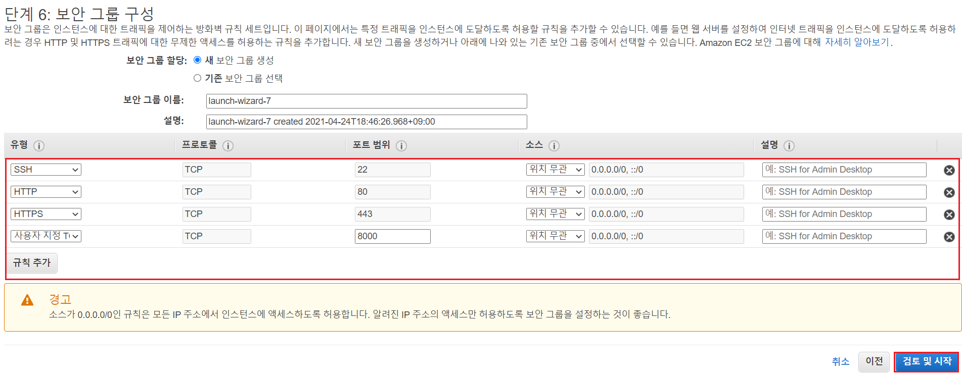 태그 추가 보안 그룹 구성을 해야 하는데, 규칙 추가 버튼을 이용해서 다음과 같이 보안을 구성하자. SSH로 통신하기 때문에 ssh를 열어뒀다. 나는 장고 웹 앱을 배포할 것이기 때문에 http, https port를 열어뒀고, django는 개발할 때 8000번 port로 동작하기 때문에, test용 port로 8000번을 열어뒀다. 그리고 '검토 및 시작'을 누르자