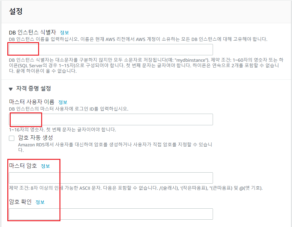 데이터베이스 생성 각각의 설정 값은 django에서 설정할 때 필요한 값이다. 'DB 인스턴스 식별자'는 RDS_NAME이 되고, '마스터 사용자 이름'은 RDS_USER, 마스터 암호는 'RDS_PASSWORD'가 된다. 이 값들은 모두 .env 파일에 추가해야 한다.