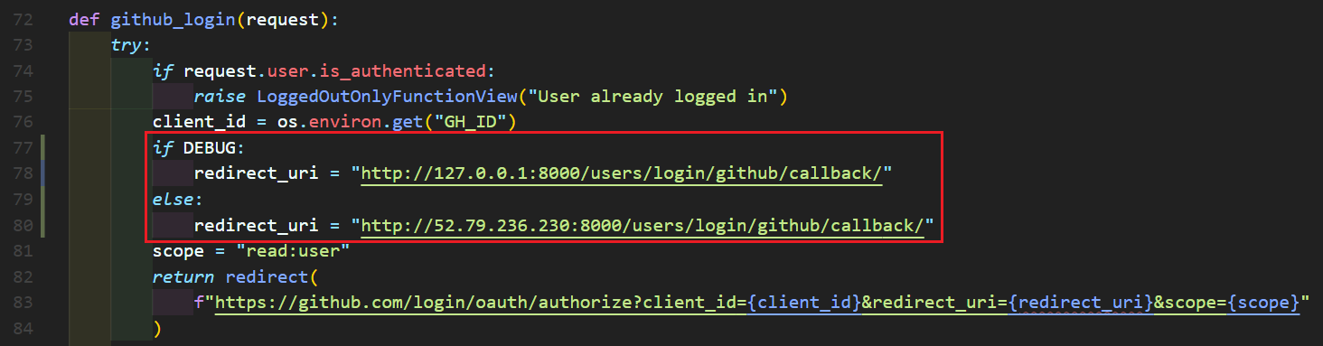 users/views.py github_login의 redirect_uri 값이 변경된 것이다. Production mode일 경우 aws ec2에 올라간 server에 public ip를 사용한다.