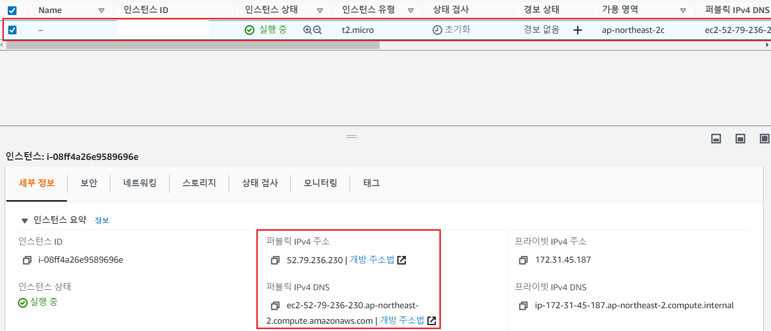 키 페어 선택 및 생성 인스턴스 생성이 완료되었다. 인스턴스 세부 정보에서 퍼블릭 ip를 확인할 수 있다.