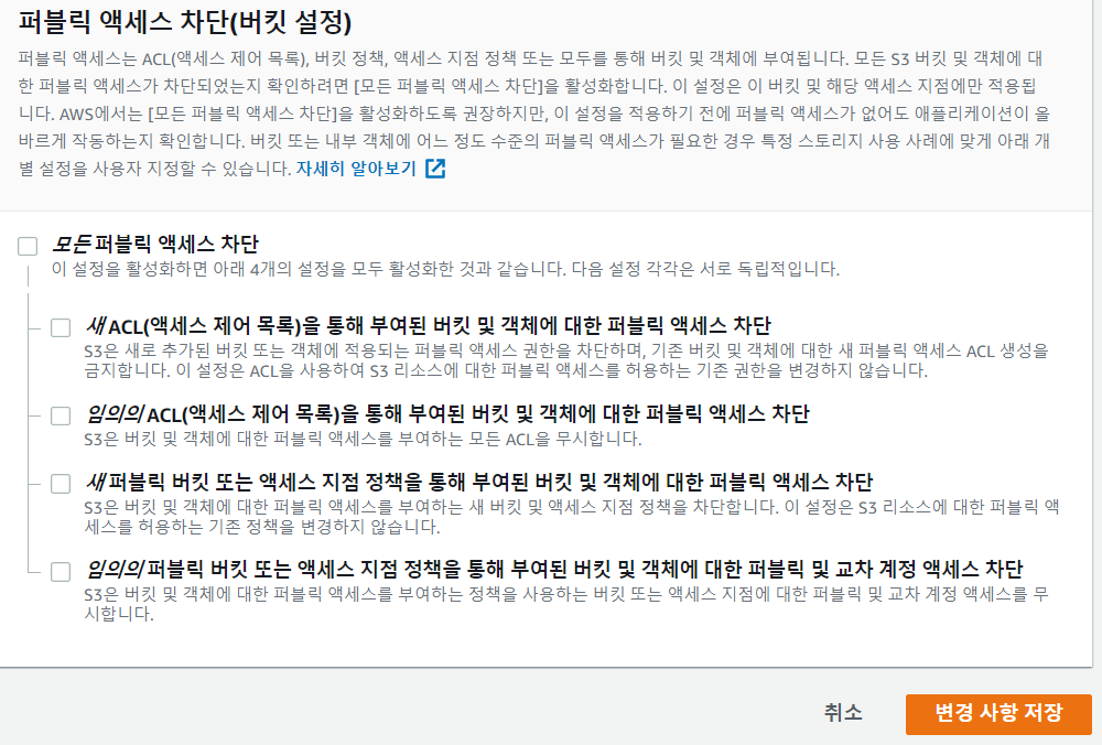 S3 일반 구성 반드시 Public을 해줘야 파일들을 업로드할 수 있다.