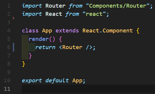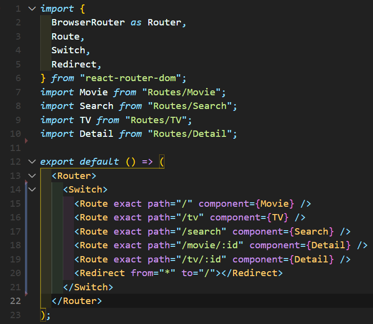 src/App.js에는 React app을 크게 좌우할 수 있는 것들을 둔다. <Router />는 페이지들을 Routing하는 component다.