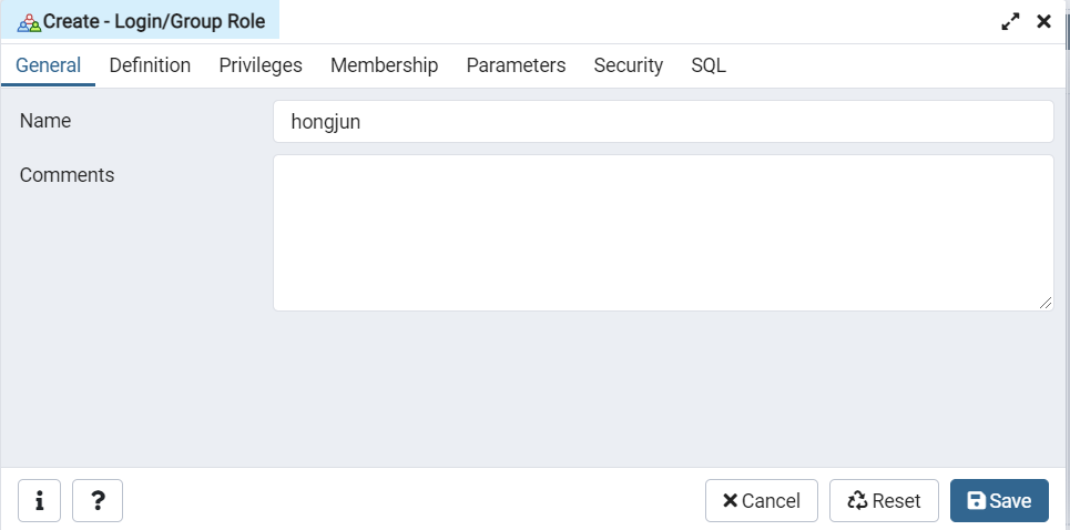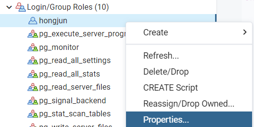 Servers => PostgreSQL 13 => Login/Group Roles => Create => Login/Group Role...을 클릭한다.