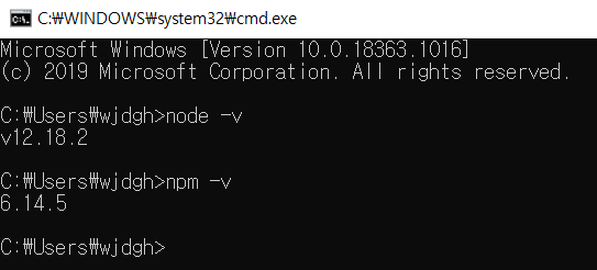 node.js 설치 cmd(혹은 terminal)에서 node -v와 npm -v를 치고 다음과 같이 버전 확인이 되면 설치가 완료된 것이다. 나는 이전에 설치한 node.js가 있어서 뒤에 버전이 다르다.