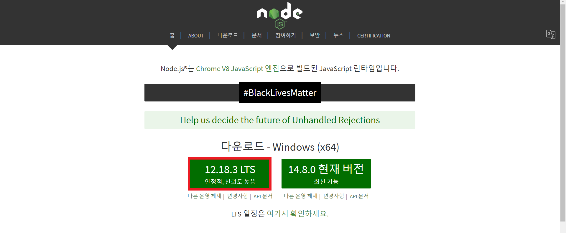 node.js는 node.js 홈페이지에서 다운 받을 수 있다. LTS 버전이 안전성을 위한 버전이고 Current 버전이 최신 기능을 담고 있다. 하지만 Current 버전은 안전화가 되어있지 않으므로 예기치 못한 에러가 발생할 수가 있다. 허나 짝수 버전은 나중에 LTS 버전이 되므로 예기치 못한 에러를 신경을 쓰지 않는다면 사용해도 무방하다. 나는 그래도 안정하고 신뢰도가 높은 LTS 버전을 사용하겠다.