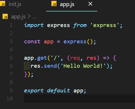 9 : 다른 파일들이 app.js 를 사용할 수 있도록 export한다. 여기서 export default라고 하였는데, 나중에 export default와 단순히 export는 차이가 있다. controller를 만들 때 export와 export default의 차이를 설명하겠다. 지금은 그냥 넘어가도 괜찮다.