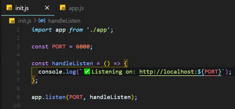 2~9 : port번호를 6000번을 할당했다. app.listen이 6000번 port로 서버를 연결하고 성공적으로 연결이 됬다면 handleListen() callback 함수를 실행시킨다.