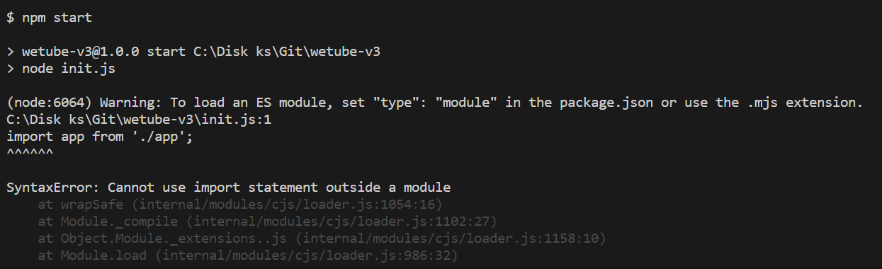 npm start error init.js와 app.js를 import 대신에 require를 사용해서 코드를 다시 작성해보았다. export default도 인식하지 못 하므로 module.exports를 사용해서 app.js를 export 했다. 나의 localhost에서 6000번 PORT가 안 되는 것을 확인하여서 5001번 으로 바꿨다.