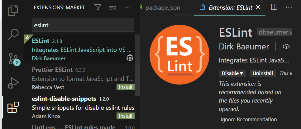module.exports = { env: { browser: true, es6: true, node: true, }, extends: ["eslint:recommended", "plugin:prettier/recommended"], parserOptions: { ecmaVersion: 2018, sourceType: "module", }, rules: { "no-console": "off", }, };마지막으로 다음 패키지를 설치해준다. prettier도 코드를 예쁘게 만들어주는 extension이다. 그러다 보니 prettier와 eslint와 충돌하게 될 때가 있다. 이것을 해결하기 위해 다음과 같은 패키지를 설치해주는 것이다. prettier를 포함한 VSC의 유용한 extension은 밑에 링크를 달아두겠다.