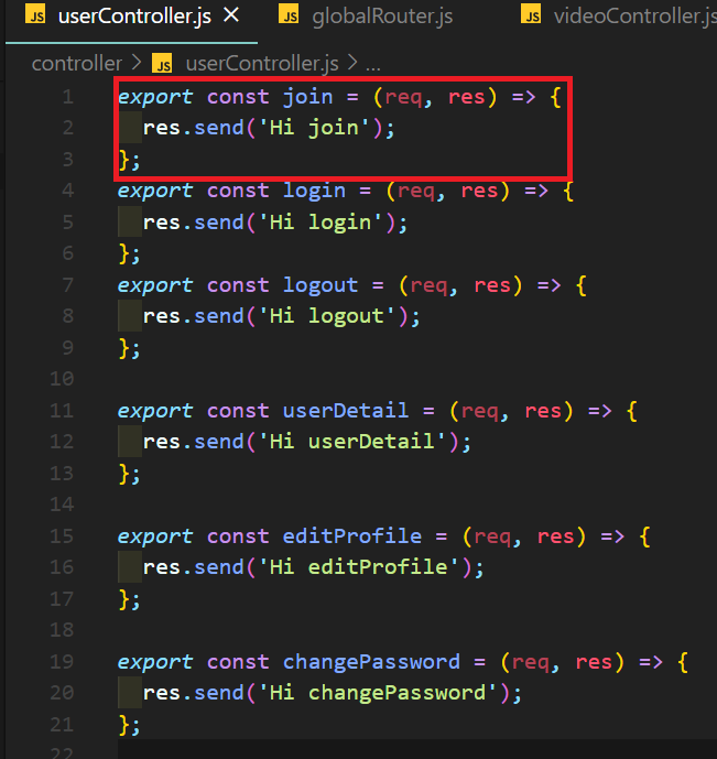 export const join = (req, res) => { res.send('Hi join'); }; export const login = (req, res) => { res.send('Hi login'); }; export const logout = (req, res) => { res.send('Hi logout'); }; export const userDetail = (req, res) => { res.send('Hi userDetail'); }; export const editProfile = (req, res) => { res.send('Hi editProfile'); }; export const changePassword = (req, res) => { res.send('Hi changePassword'); };userController.js다. routes.join이 실행이 되면 userController.js 안에 있는 join이 실행이 되고 res.send('Hi join')가 실행이 된다. router를 만드는 단계이기 때문에 controller 파트는 아직 제대로 구현하지는 않았다.