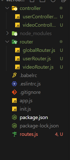 이제 개발을 위한 기본적인 세팅은 끝났다. 이번에 할 작업은 router다. youtube(가제 wetube)를 사용하기 위해서는 필요한 기능들이 있다. home, uploading video, join, login and etc...이다. 이러한 기능들은 사용자가 해당 URL을 접속했을 때 사용할 수 있다. 사용자가 어떤 URL을 접속하냐에 따라 서버가 그에 따른 페이지를 보여줘야 하는데, 이것을 routing 작업이라고 한다. 여기서 내가 만들 파일은 크게 2가지다. routes.js와 Router(globalRouter.js, userRouter.js, videoRouter.js)다.
