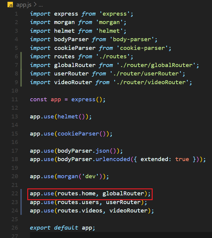 import express from 'express'; import morgan from 'morgan'; import helmet from 'helmet'; import bodyParser from 'body-parser'; import cookieParser from 'cookie-parser'; import routes from './routes'; import globalRouter from './router/globalRouter'; import userRouter from './router/userRouter'; import videoRouter from './router/videoRouter'; const app = express(); app.use(helmet()); app.use(cookieParser()); app.use(bodyParser.json()); app.use(bodyParser.urlencoded({ extended: true })); app.use(morgan('dev')); app.use(routes.home, globalRouter); app.use(routes.users, userRouter); app.use(routes.videos, videoRouter); export default app;