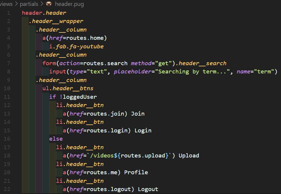 header.pug header.pug를 보면 if else 문이 있는데 pug는 JS 코드를 사용할 수가 있다. login된 유저일 경우 upload, profile과 logout을 보여주고 아닐 경우 join과 login 기능만 보여준다. loggedUser는 변수인데, 이 부분은 서버 쪽에서 middleware들로 데이터를 넘겨주면서 그 안에 같이 있는 변수다. 이 변수를 생성하는 middlewares.js라는 파일을 다음 블로그에서 만드는 것을 보여줄 것이다. 그 외에도 반복문 사용이 가능하다.