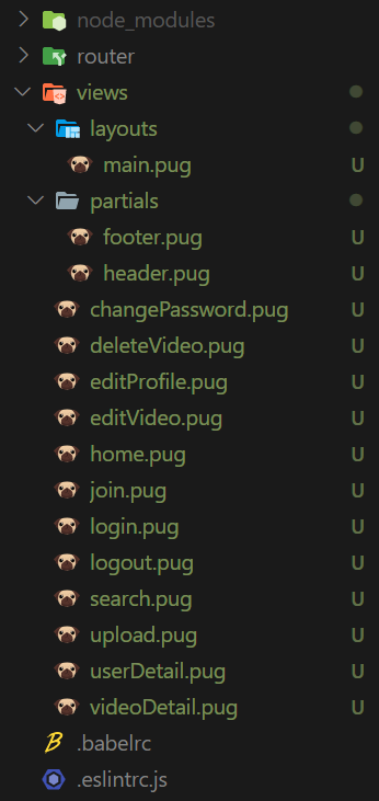 views 디렉토리 흐름은 이렇게 된다. init.js가 실행 -> app.js가 실행 -> 사용자가 접속한 url에 해당하는 router가 작동(예를 들어 join을 들어갔다고 해보자.) -> app.use(routes.home, globalRouter) on app.js가 실행 -> globalRouter.get(routes.join, join) on globalRouter.js가 실행 -> join on controller.js가 실행이 된다. 여기서 join은 res.send가 아닌 res.render('join')으로 바껴있다.