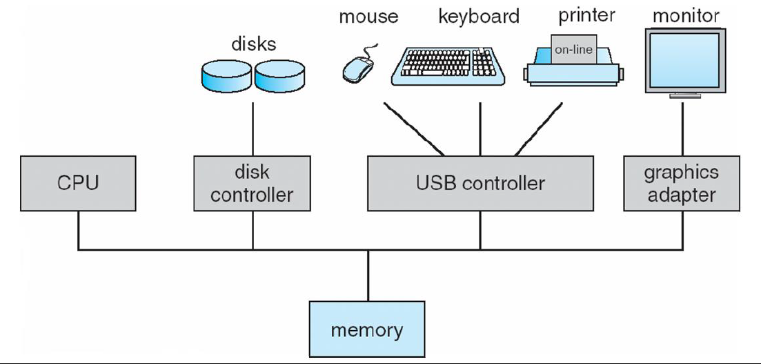 컴퓨터 시스템의 큰 그림 CPU, 메인 메모리와 장치 제어기(device controller)는 시스템 버스로 서로 연결되어 있다. CPU와 장치 제어기는 메모리 사이클(meomory cycle)을 얻기 위해 서로 경쟁하면서 동시에 수행한다.