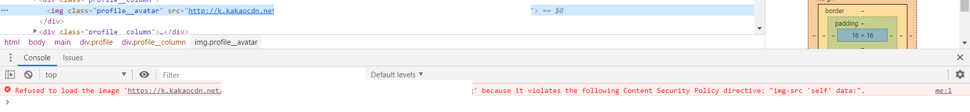 error의 내용을 살펴보면 Refused to load the image 'URL' because it violates the following Content Security Policy directive: "img-src 'self' data:". 이라고 한다.