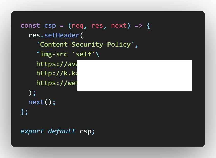이 문제를 해결하기 위해서는 kakao와 github의 avatarUrl 주소가 신뢰할 수 있음을 인지시켜줘야 한다. csp.js 파일을 생성하고 http header에 다음 내용을 추가하는 코드를 작성한다.