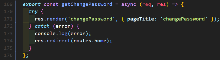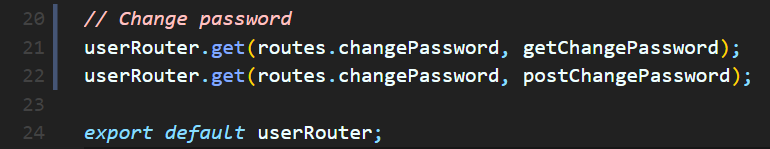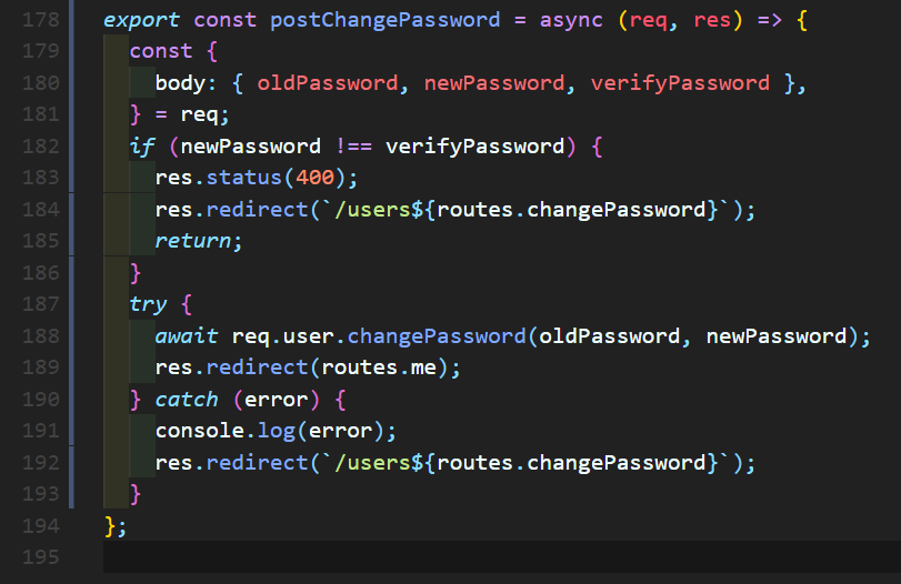 getChangePassword 사용자로부터 newPassword와 verifyPassword를 받고 두 개의 값이 다르면 http status code로 400번을 보내고 다시 password를 입력 하도록 한다.