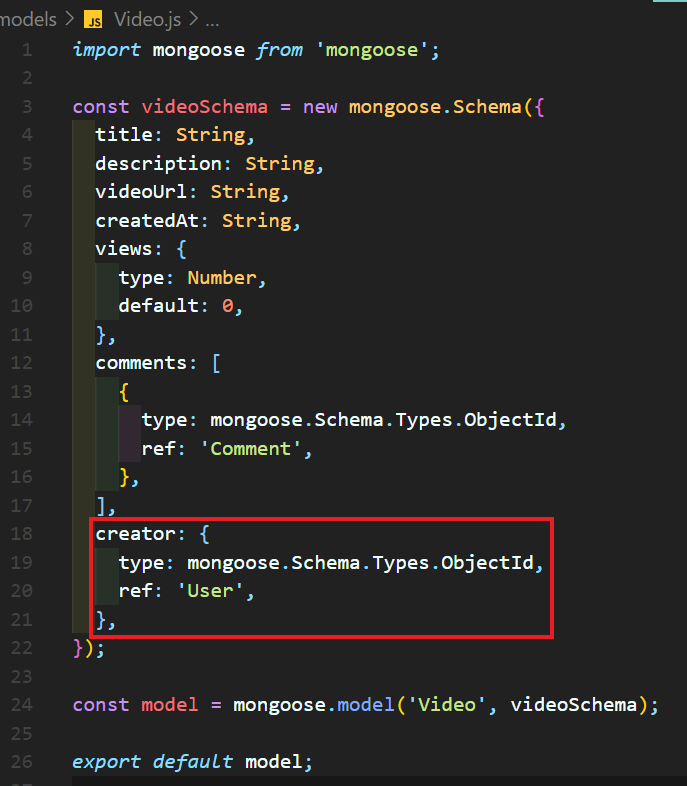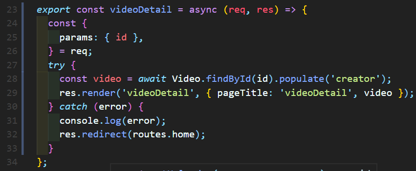 req.params.id는 url 경로에서 :id 값을 가져온다. 해당 id 값은 videoId 값이다. 이 값으로 DB에서 video를 찾는다. 여기서 populate는 video 모델의 객체를 가져오는 것이다. populate('creator')를 하면 videoSchema에서 객체로 정의한 creator를 가져온다.