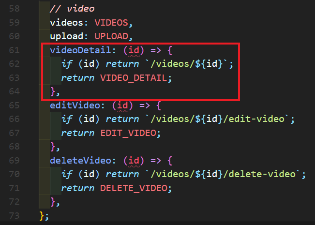 videoDetila, editVideo, deleteVideo와 userDetail은 다른 routes와는 다르다. 이들은 고유 id 값에 따라 보여줘야 하는 페이지가 다르기 때문이다. 다른 routes은 key-string이지만 이들은 key(함수명) - value(함수)으로 이루어져 있다. 인자로는 id 값을 받는다.