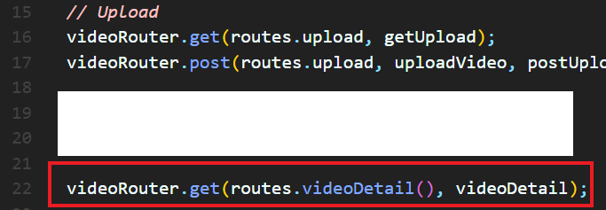 videoRouter.js를 보면은 첫번째 인자인 router를 주는 값도 다르다. 다른 router는 string을 주지만 videoDetail은 routes.videoDetail()로 함수를 준다. 또한 route를 함수로 주는 router들은 다른 router들보다 항상 맨 밑에 있어야 한다. 그렇지 않으면 다른 router들은 작동하지 않는다.