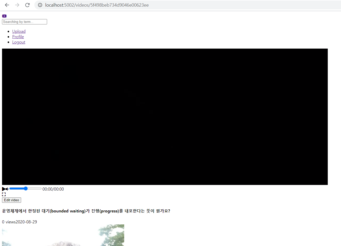 videoPlayer.pug 그렇게 되면 다음과 같이 videoPlayer가 화면에 나온다. (화면이 검은 이유는 내가 올린 영상의 thumbnail이 검은색이기 때문이다.)