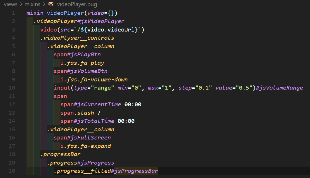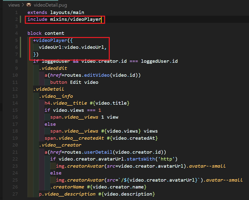 videoDetail.pug mixin 파일은 pug와 똑같은 방식으로 작성하되 맨 위에