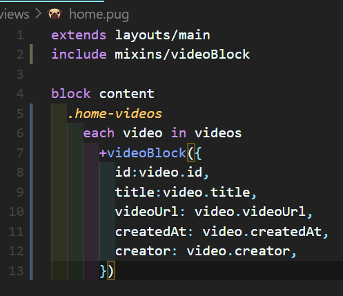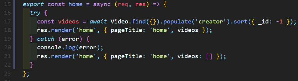 Video.find({})로 모든 video 파일들을 가져온다. videoBlock에 creator도 추가해줘야 하기 때문에 populate('creator')로 creator도 가져온다. video는 맨 처음 upload된 파일이 배열의 맨 앞에 있다. 하지만 우리는 나중에 올린 것이 최신 파일이기 때문에 처음으로 보고 싶다. 그러기 위해서 sort({_id : -1})을 해준다. -1값을 줘서 순서를 reverse한 것이다.