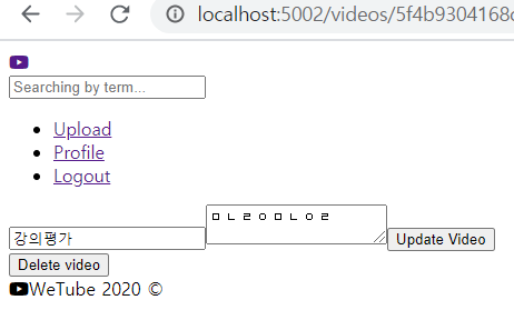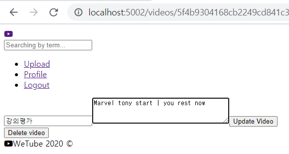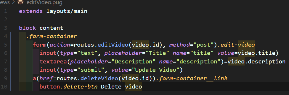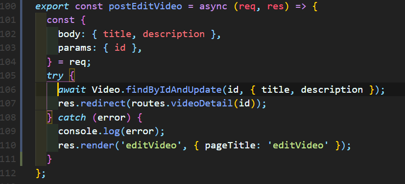 getEditVideo 사용자로부터 수정할 title과 description을 받는다. Video.findByIdAndUpadate를 통해서 id 값에 해당하는 video의 title과 description을 수정하고 수정된 videoDetail을 보여준다.
