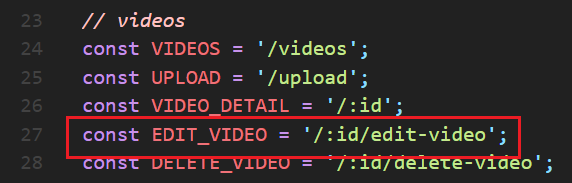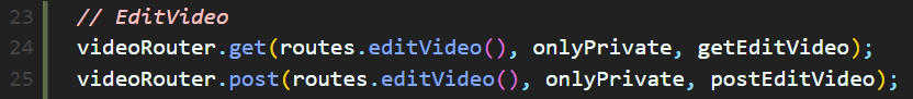 videoRouter.js를 보면은 첫번째 인자인 router를 주는 값도 다르다. 다른 router는 string을 주지만 videoDetail은 routes.editVideo()로 함수를 준다. 또한 route를 함수로 주는 router들은 다른 router들보다 항상 맨 밑에 있어야 한다. 그렇지 않으면 다른 router들은 작동하지 않는다.
