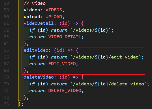 videoDetila, editVideo, deleteVideo와 userDetail은 다른 routes와는 다르다. 이들은 고유 id 값에 따라 보여줘야 하는 페이지가 다르기 때문이다. 다른 routes은 key-string이지만 이들은 key(함수명) - value(함수)으로 이루어져 있다. 인자로는 id 값을 받는다.