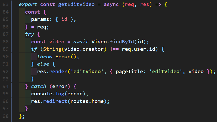 req.params.id는 url 경로에서 :id 값을 가져온다. 해당 id 값은 videoId 값이다. 이 값으로 DB에서 video를 찾는다. populate로 가져오지 않은 video.creator는 객체이기 때문에 String으로 형변환을 해줘야 한다. 그 후 현재 user의 id 값과 비교해서 video를 편집하려는 사용자가 video의 작성자가 맞는지를 확인한다. 그렇지 않다면 editVideo 페이지를 보여주지 않는다.