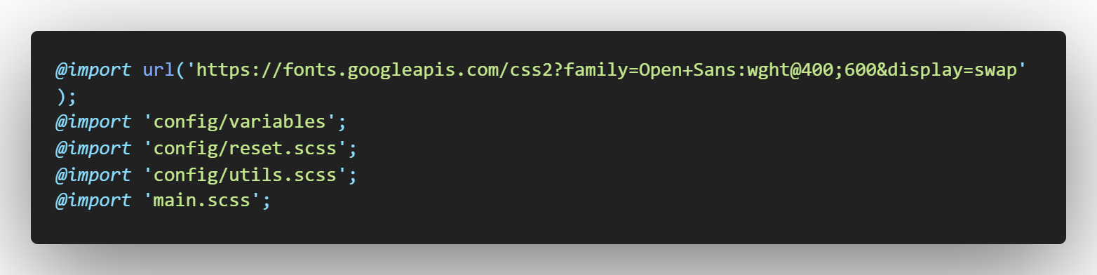 body { font-family: 'Open Sans', sans-serif; // font-family: 'Caesar Dressing', cursive; } a { text-decoration: none; } main { min-height: 70vh; max-width: 1200px; margin: 0 auto; } button { background-color: #3498db; color: white; padding: 7px 10px; font-weight: 600; font-size: 16px; border-radius: 8px; border: none; cursor: pointer; box-shadow: 1px 4px 5px #e0e0e0; width: 100%; max-width: 400px; padding: 10px 5px; }styles.scss에는 내가 만든 scss 파일들을 만들 때마다 추가해준다.