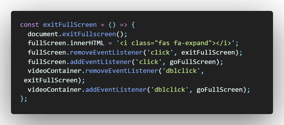 - 그 후 fullscreen 버튼을 눌렀거나 다시 더블클릭했을 때 화면이 축소될 수 있도록 goFullScreen event를 제거하고 exitFullScreen event를 추가했다.