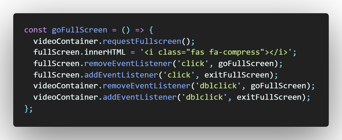 goFullScrenn() - 사용자가 fullScrenn 버튼을 눌렀거나 videoContainer를 더블클릭했을 때 goFullScreen이 실행되도록 구현했다.
