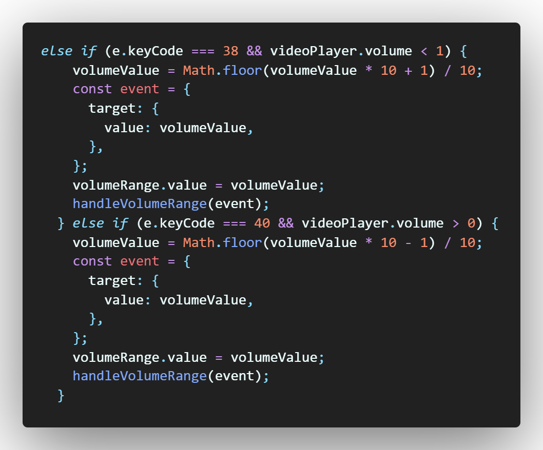 videoPlayer.pug volume up & down의 keyboard 단축키는 화살표 위 아래다. keyCode 값이 위 방향은 38, 아래 방향은 40이다. volumeRange의 범위는 min=0, max=1, step=0.1이다.